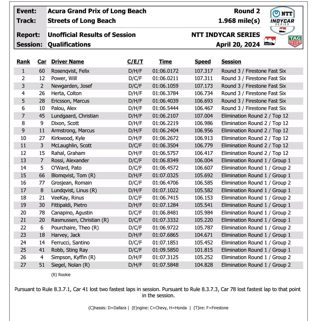 Graham Rahal ha fatto segnare il primo tempo in questo Warm-Up a Long Beach con un 01:07.0485, seguito dal campione in carica Alex Palou con 01:07.0932 mentre a concludere il podio Josef Newgarden, vincitore della prima gara stagionale con un tempo di 01:07.1814.